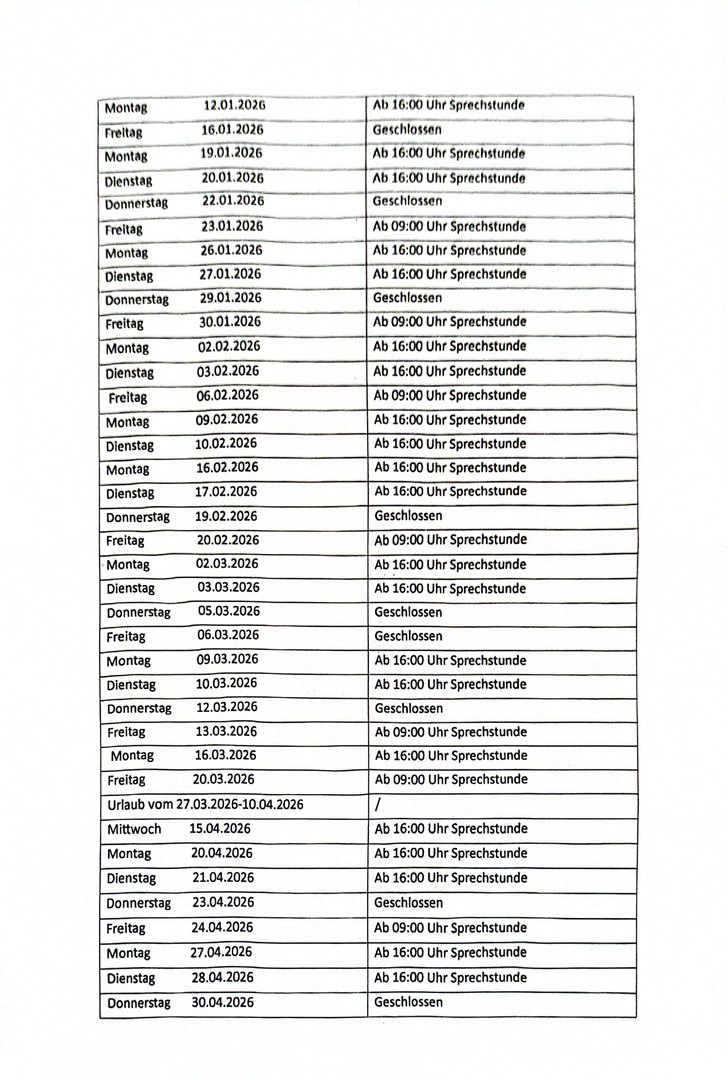 die Sprechzeiten entnehmen Sie bitte dem Textfeld der Startseite links unten.